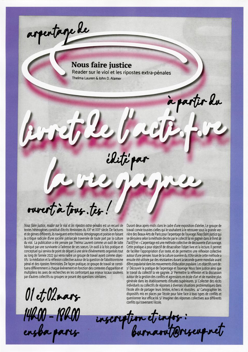 Durant deux après-midis dans le cadre d’une exposition d’atelier, Le groupe de travail convie tous·tes celleux qui le souhaitent à le retrouver sous la grande verrière des Beaux-Arts de Paris pour l’arpentage de l’ouvrage Nous faire justice qui se déroulera selon la méthode décrite par le collectif La vie gagnée dans Le livret de l’actif·f·ve : “L’arpentage est une méthode collective de découverte d’un ouvrage. Cette pratique à pour objectif de désacraliser l’objet livre et la lecture. Il permet de faciliter l’appropriation d’un texte, et de permettre une réflexion collective autour d’une pensée. Issue de la culture ouvrière du XIXe siècle cette méthode a ensuite été utilisée par des résistant·es durant la seconde guerre mondiale avant d’être popularisé dans les mouvements d’éducation populaire.” Les objectifs sont de : * Découvrir la pratique de l’arpentage et l’ouvrage Nous faire justice ainsi que le travail du collectif La vie gagnée. * Permettre la réflexion et la discussion autour de la gestion des conflits et agressions en école d’art et de manière plus générale dans les établissements d’études supérieures. * Collecter des récits individuels ou collectifs de réponses à diverses situations problématiques dans l’école afin de partager leurs limites, échecs et réussites. * Cartographier les dispositifs mis en places par l’école pour faire face à tous types de conflits et questionner leur efficacité. * Imaginer des réponses collectives aux différents conflits qui traversent l’école