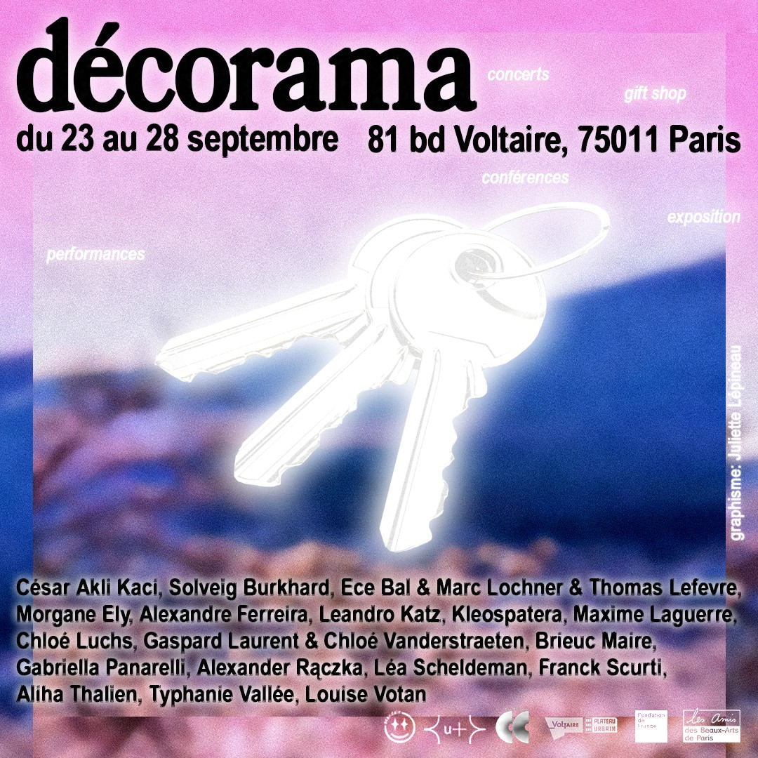 L’exposition DÉCORAMA s’inspire des appartements témoins, des dioramas, des vitrines de noël : des décors transformés en image, qui se succèdent. On défile de scénette en scénette comme un livre pop-up, où chaque page est un monde artificiel. Les artistes de DÉCORAMA répondent à la même contrainte : chacun.e choisit une image ou un motif, imprimé sur papier peint, qui sert de toile de fond à son décor. Chaque artiste a son espace, la projection de son monde intérieur. La sélection des artistes fédère plusieurs générations; des étudiant.e.s, des ancien.ne.s étudiant.e.s, des artistes confirmé.e.s. Une communauté qui questionne le récit, la polarité entre objet et image, réalité et fiction. Les pages se relient les unes aux autres avec la narration que les spectateur·trices veulent bien lui donner, créant de la même exposition une multiplicité de récits.