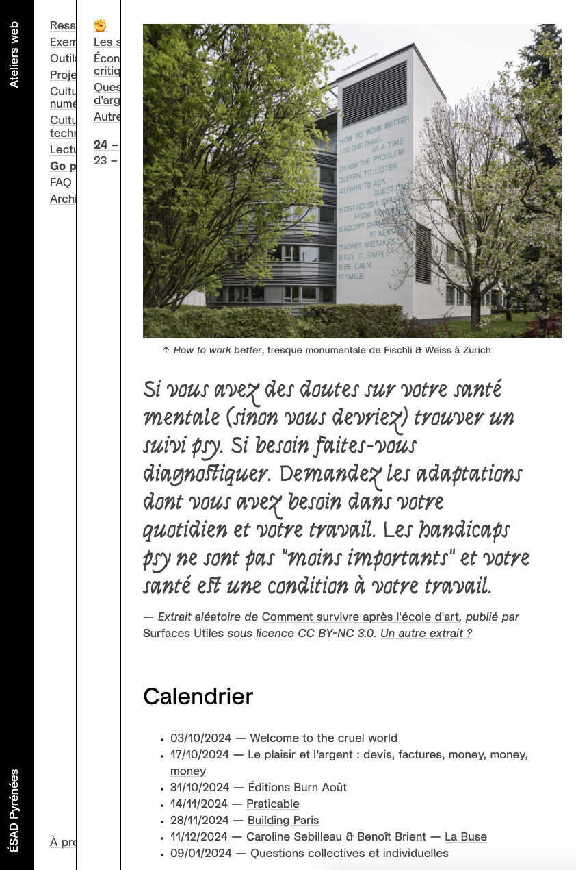 « Les enjeux de la professionnalisation en école d’art sont parcourus par de nombreuses tensions (les résoudre n’est pas dans les objectifs de la liste de ressources rassemblées ci-dessous). Les différentes approches d’un devenir professionnel souhaitable pour les aspirant⋅es designers et artistes doivent être pensées de manière critique, en tenant compte de leurs inscriptions dans des contextes sociaux, économiques, écologiques, politiques dont la complexité n’est plus à démontrer. »