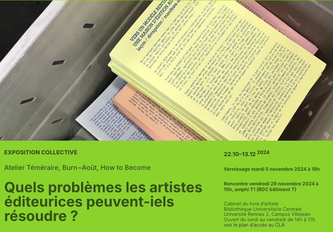 Le vendredi 29 novembre 2024, on était au Cabinet du livre d’artiste, Bibliothèque Universitaire Centrale, Université Rennes 2 (Rennes) pour une rencontre avec les étudiant·es de l’université et une présentation des éditions Burn~Août et de l’Atelier téméraire.