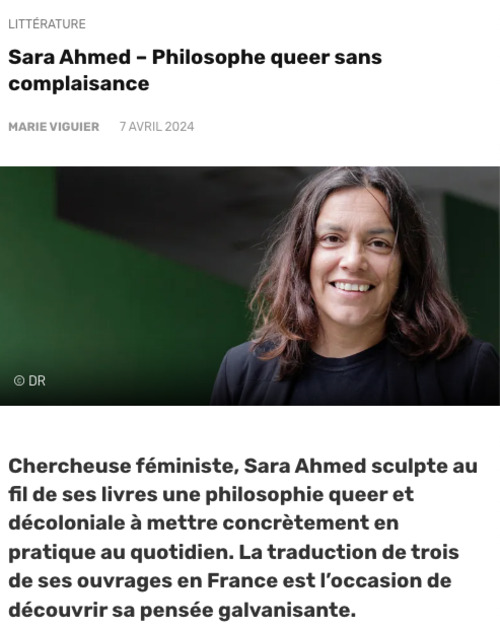 Chercheuse féministe, Sara Ahmed sculpte au fil de ses livres une philosophie queer et décoloniale à mettre concrètement en pratique au quotidien. La traduction de trois de ses ouvrages en France est l’occasion de découvrir sa pensée galvanisante.