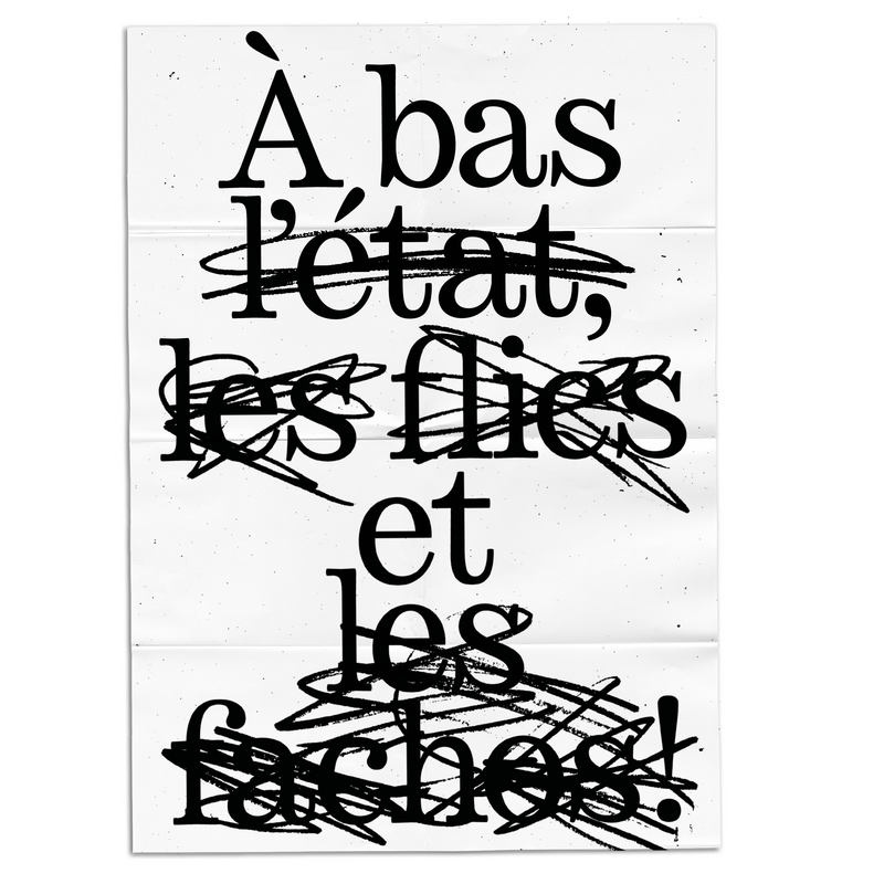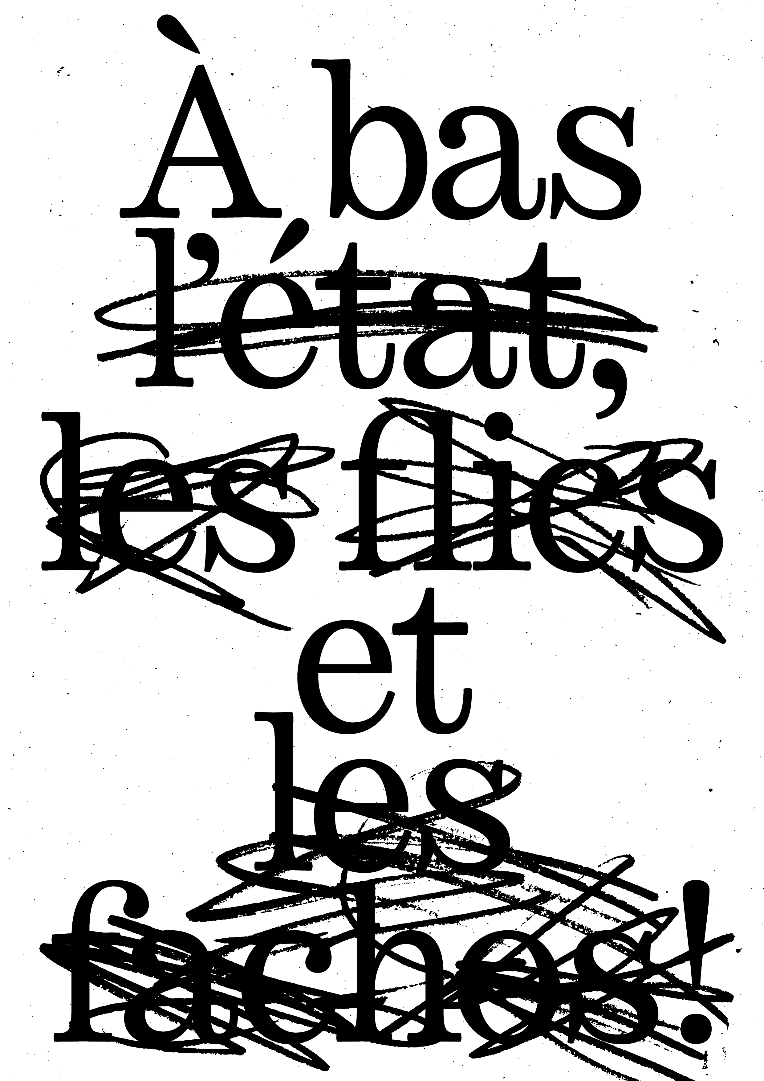 Affiche réalisée par Service Local (Clémentine L. et Gautier S.) pour la campagne de financement de l’ouvrage « À bas l’état, les flics et les fachos ».