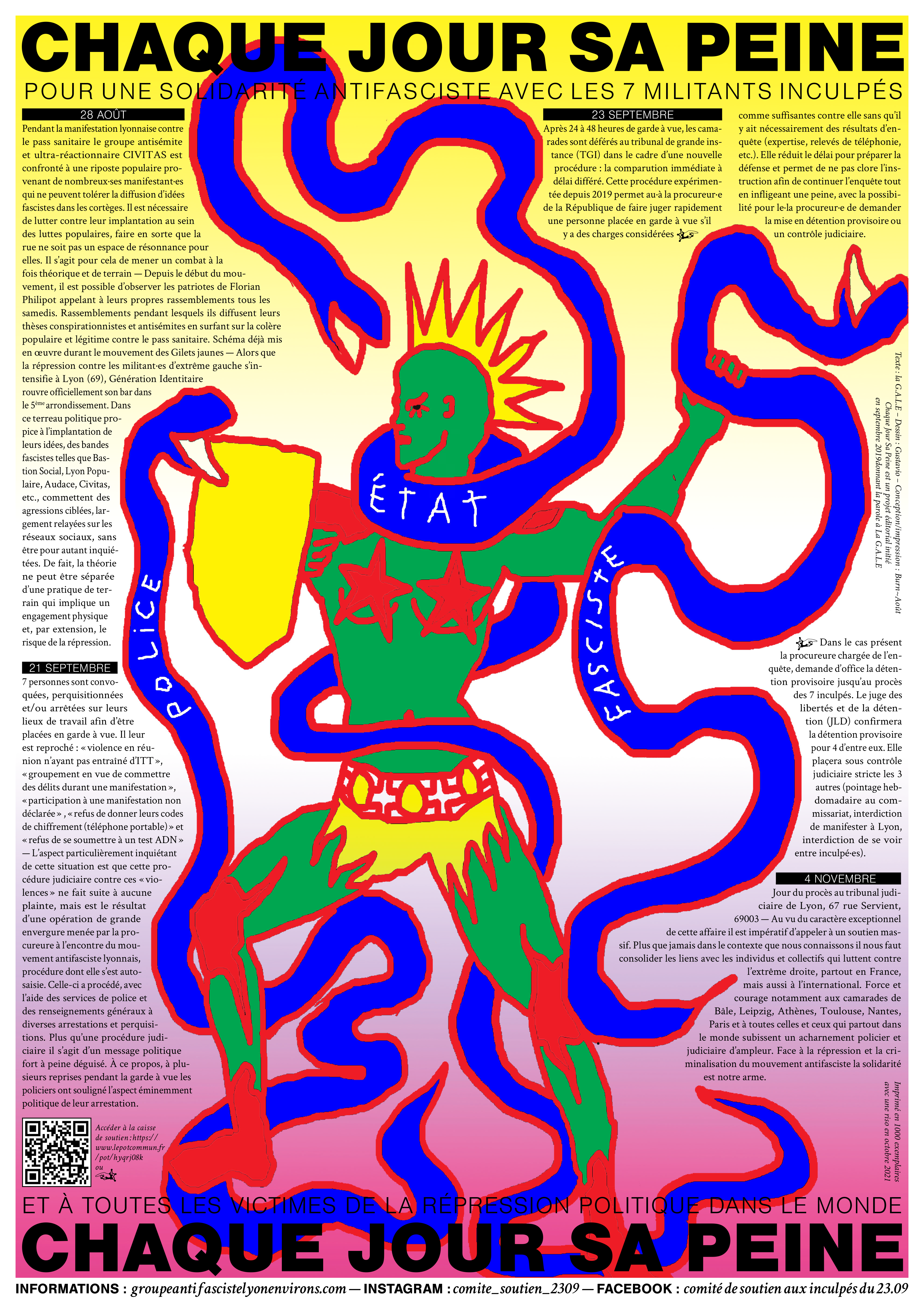 À la suite d’une bagarre survenue au cours d’une manifestation anti-pass lors de l’été 2021, sept militants antifascistes lyonnais ont été accusés de violences en réunion. En publiant cette affiche, dans le cadre du projet Chaque jour sa peine entreprit un an plus tôt avec la GALE, nous apportons notre soutien aux inculpés. L’affiche a été imprimée en 2000 exemplaires et puis donnée à différents réseaux antifascistes pour qu’ils la distribuent de leur côté.