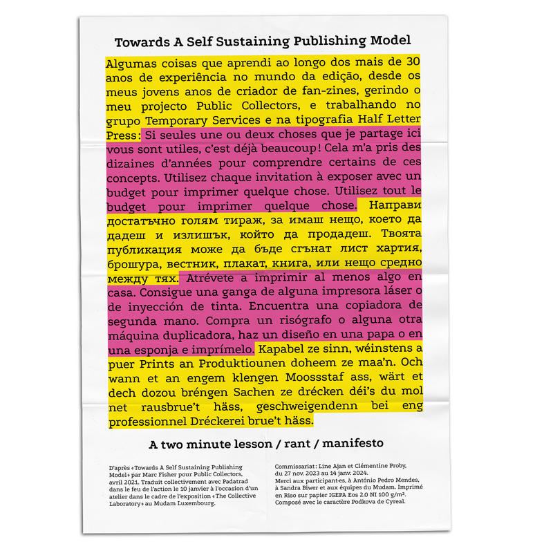 D’après Towards A Self Sustaining Publishing Model par Marc Fisher pour Public Collectors, avril 2021. Traduit collectivement avec Padatrad dans le feu de l’action le 10 janvier 2024 à l’occasion d’un atelier dans le cadre de l’exposition The Collective Laboratory au Mudam Luxembourg. Commissariat : Line Ajan et Clémentine Proby,du 27 nov. 2023 au 14 janv. 2024. Merci aux participant·es, à António Pedro Mendes,à Sandra Biwer et aux équipes du Mudam. Impriméen Riso sur papier IGEPA Eos 2.0 NI 100 g/m².Composé avec le caractère Podkova de Cyreal.